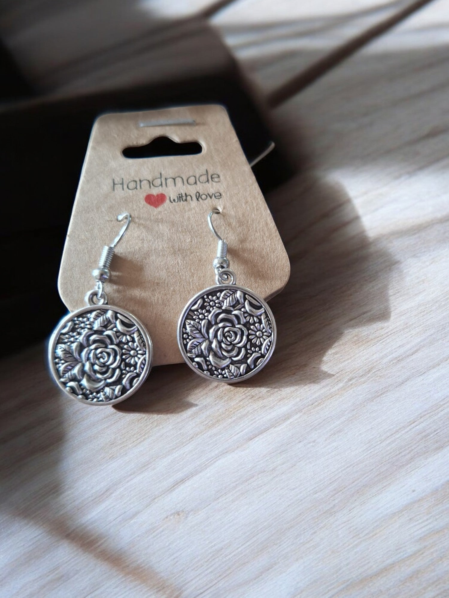 Deze prachtige handgemaakte oorringen met rozenmotief zijn als kleine kunstwerkjes voor je oren. Het sierlijke reliëf geeft een vintage touch, terwijl de ronde vorm zorgt voor een zachte en elegante uitstraling. Perfect voor liefhebbers van bloemen én tijdloze stijl!