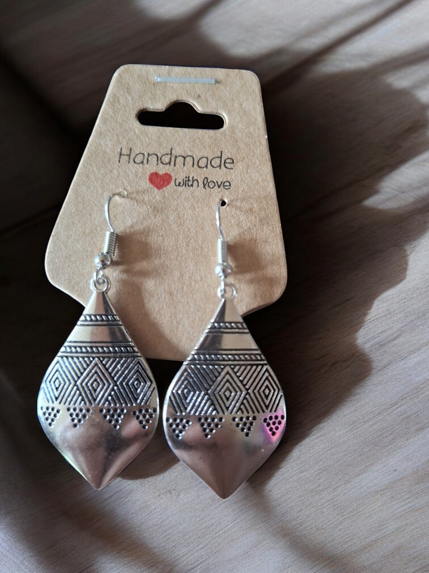 Deze handgemaakte oorringen zijn gemaakt voor vrouwen met lef! De zilverkleurige druppelvorm met diepzwarte tribal gravures maakt van elke outfit een avontuur. Lichtgewicht maar vol karakter – klaar om jouw stijlverhaal te vertellen.