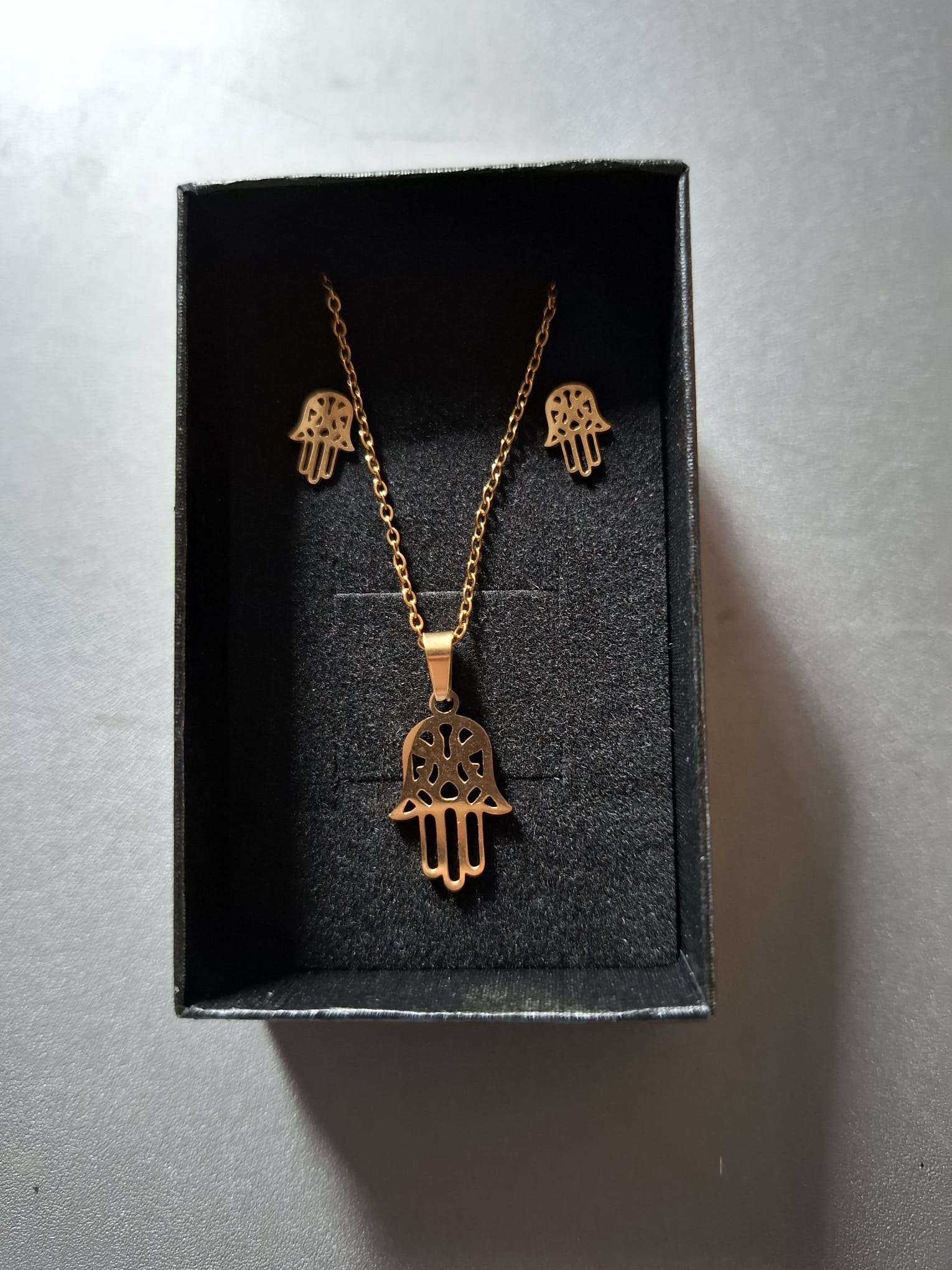 Deze vrolijke gouden ketting met bijpassende oorbellen in de vorm van een Hamsa-hand is niet alleen super stijlvol, maar staat ook symbool voor geluk, bescherming en positiviteit. Ideaal voor kleine avonturiers die graag een tikje mystiek dragen!