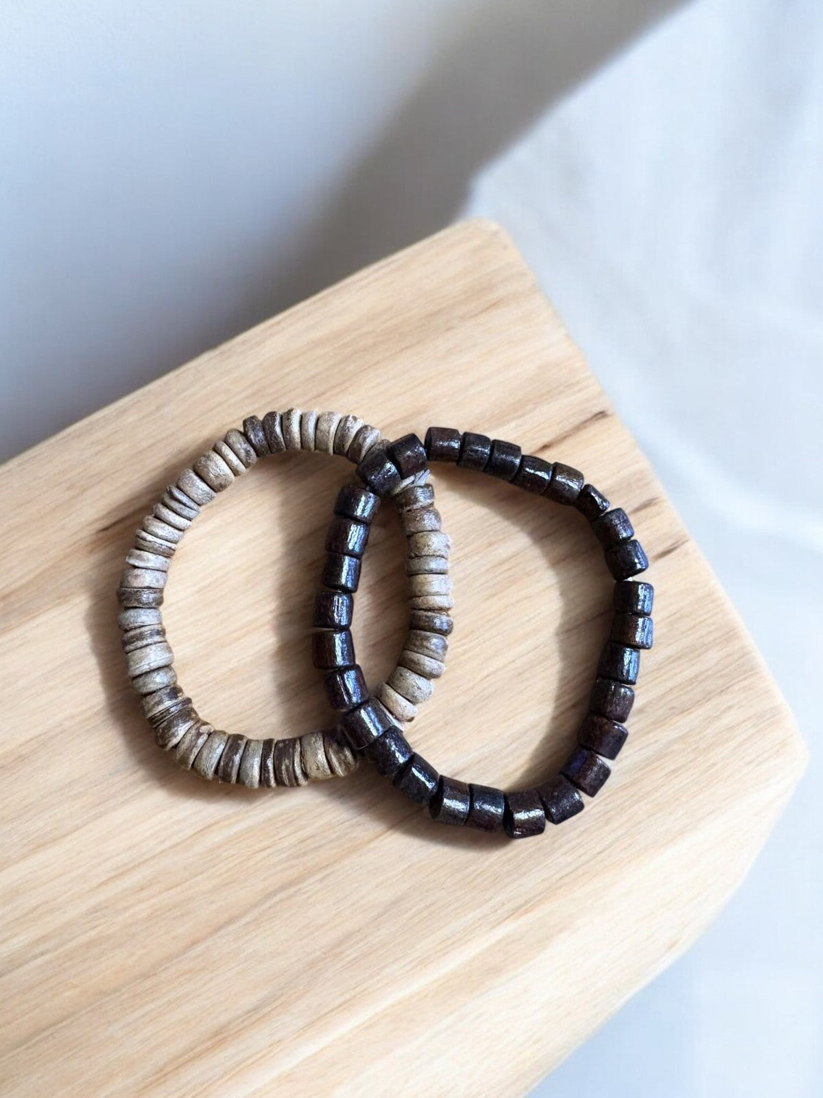 Eenvoud, textuur en karakter. Deze handgemaakte houten armbandenset straalt aardse kracht uit met een tijdloze, minimalistische stijl.