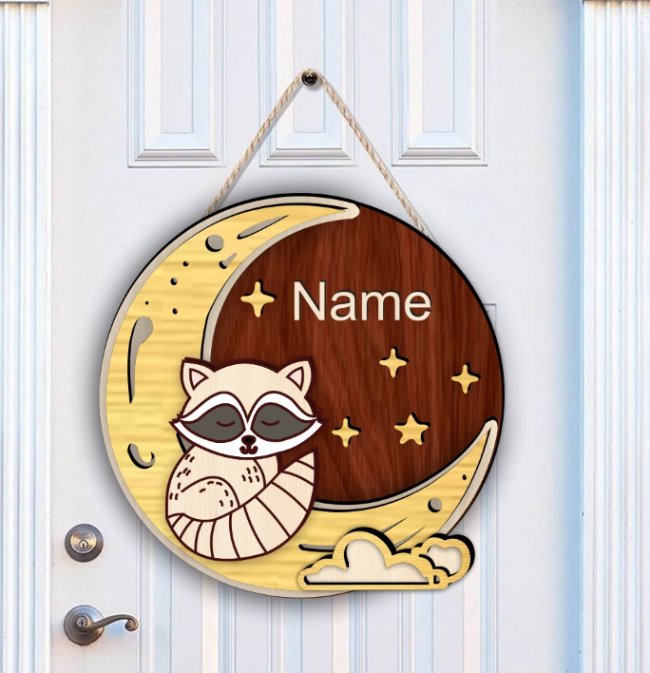 Laat dromen beginnen bij de voordeur of kinderkamer met dit betoverende houten naambordje! Met een schattige slapende wasbeer op een maan, is dit bordje ideaal als deurhanger of wanddecoratie.
