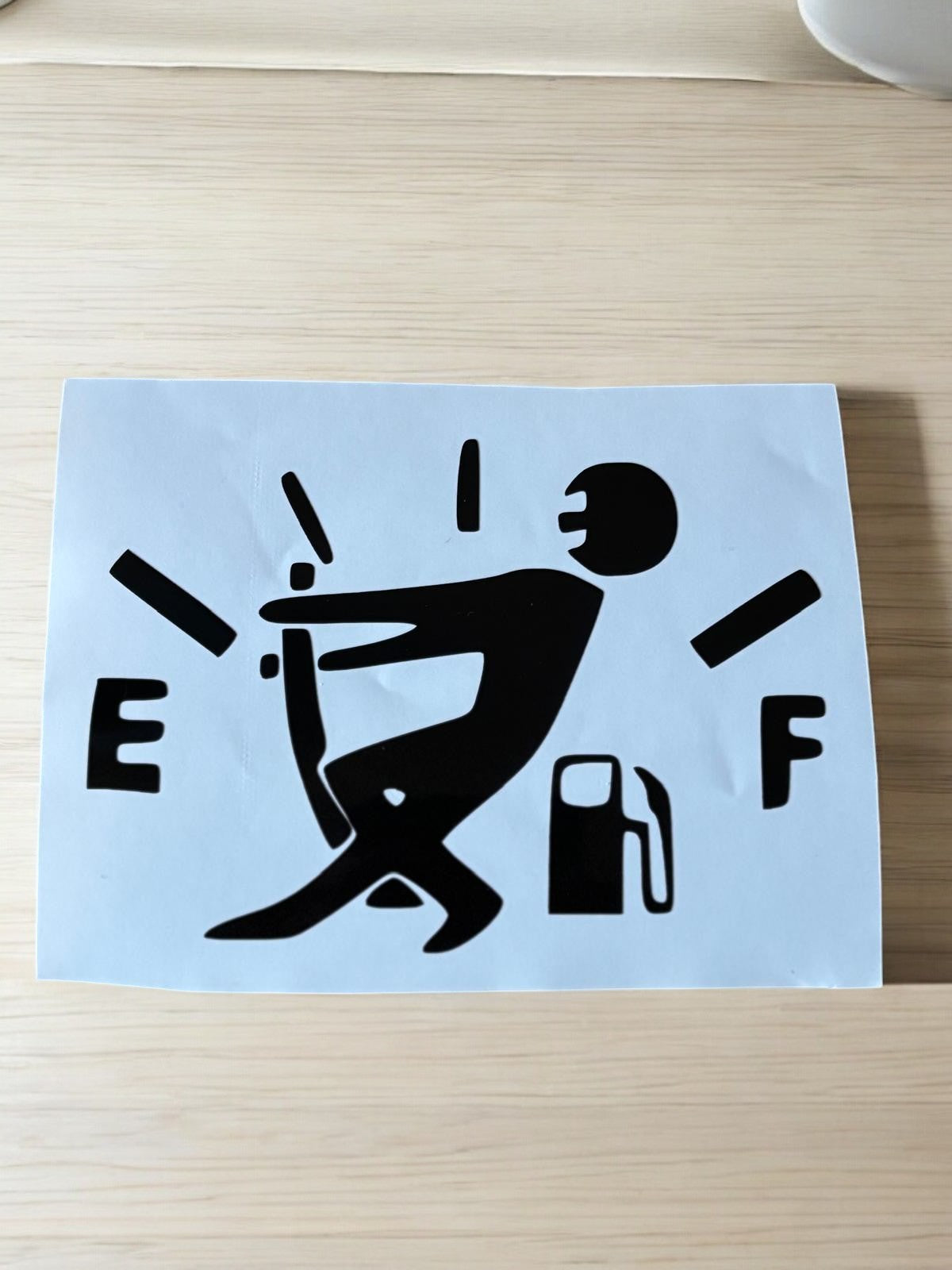 Deze hilarische sticker laat precies zien hoe het voelt als je weer bijna zonder benzine zit – met een knipoog! Perfect voor autoliefhebbers met humor.