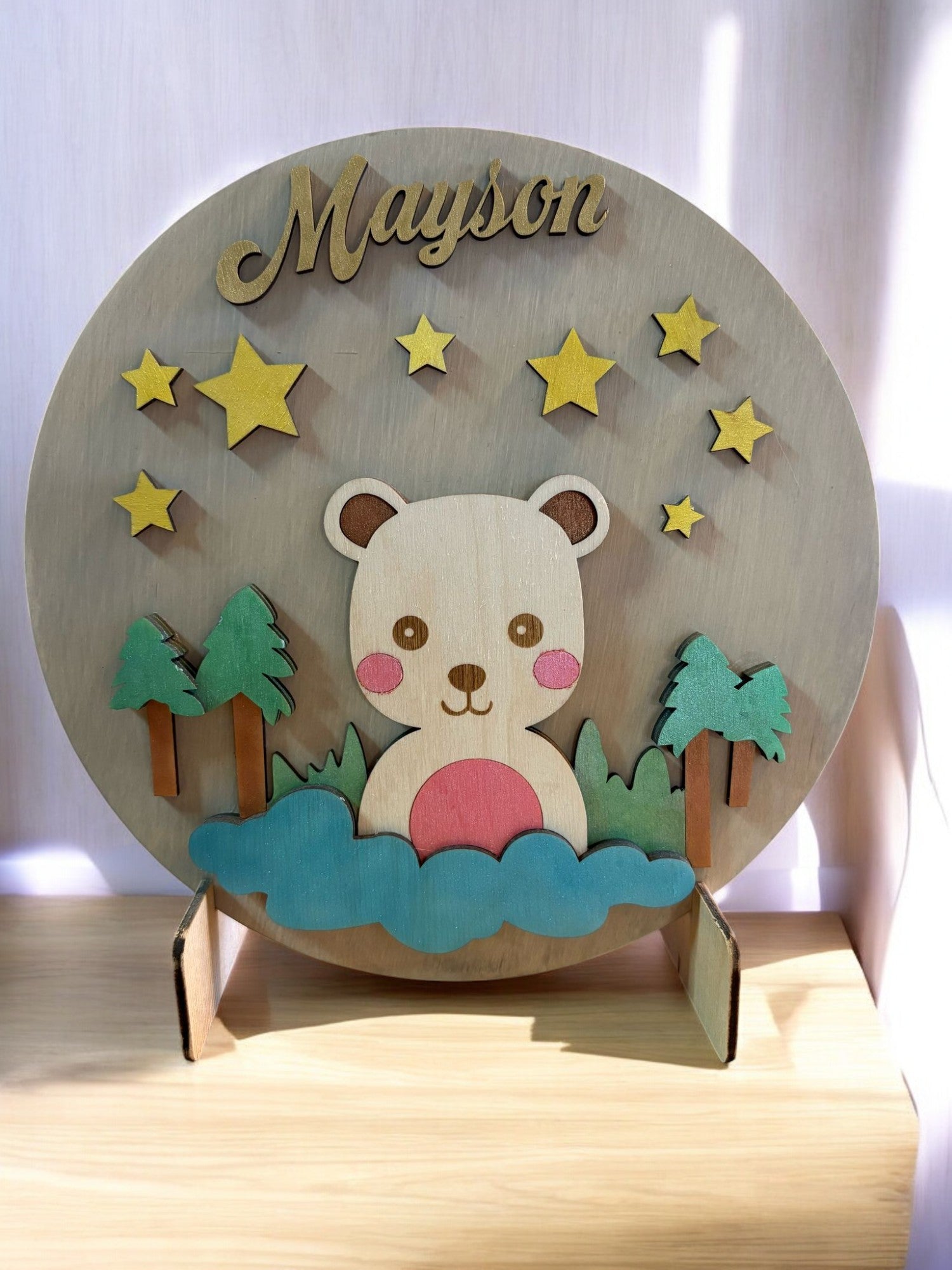Maak de kinderkamer extra bijzonder met dit prachtige houten naambord met beertje! Dit ronde bord is voorzien van een lief berenfiguurtje, kleurrijke bomen, wolkjes én een naam naar keuze in sierlijke houten letters. De gele sterren geven het geheel een magische uitstraling.
