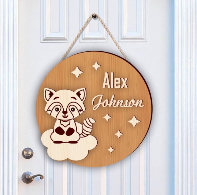 Laat je kleintje stralen met dit unieke houten naambordje featuring een schattige wasbeer op een wolkje! Met ruimte voor zowel voor- als achternaam is dit bordje perfect als deurdecoratie of muuraccessoire in de kinderkamer.