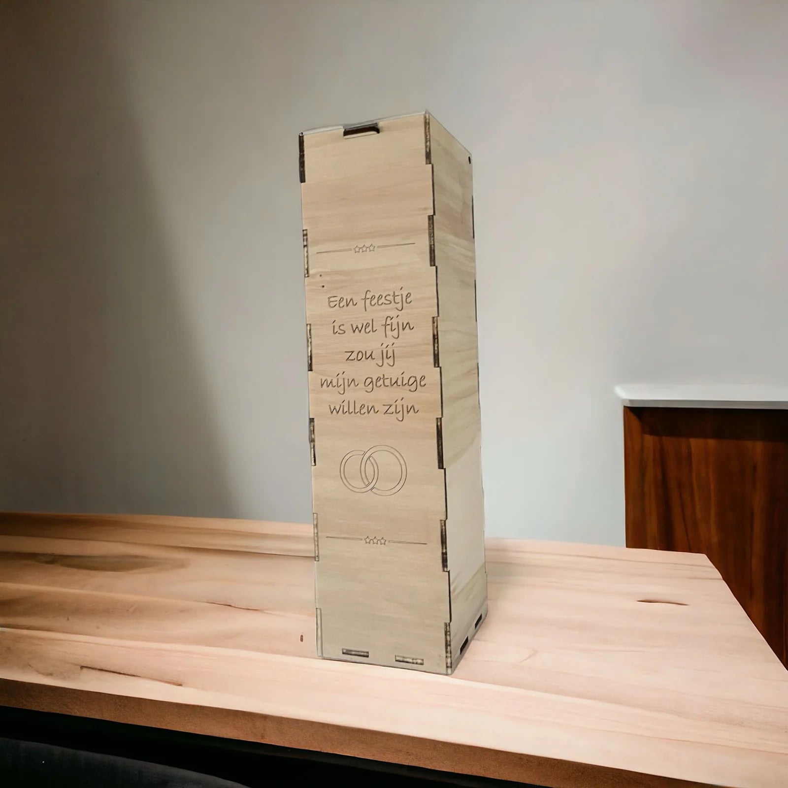 De tekst "Een feestje is wel fijn, zou jij mijn getuige willen zijn?" is met precisie in het hout gegraveerd en zorgt gegarandeerd voor een glimlach (of traantje). Plaats je favoriete fles wijn in de box en je hebt een betekenisvol én bruikbaar cadeau in één.