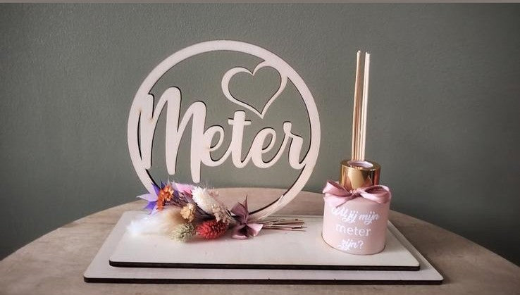 Verras je meter met deze stijlvolle cadeauset. De set bevat een houten decoratiecirkel met het woord “Meter” en een hartje, vergezeld van een flesje met geurstokjes en een boeketje droogbloemen. Beschikbaar in verschillende kleuren en teksten op het geurflesje.