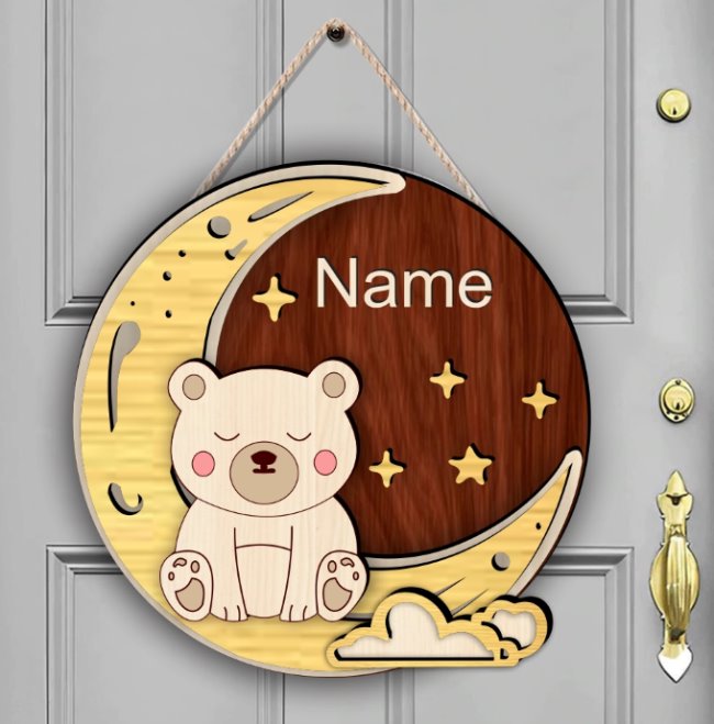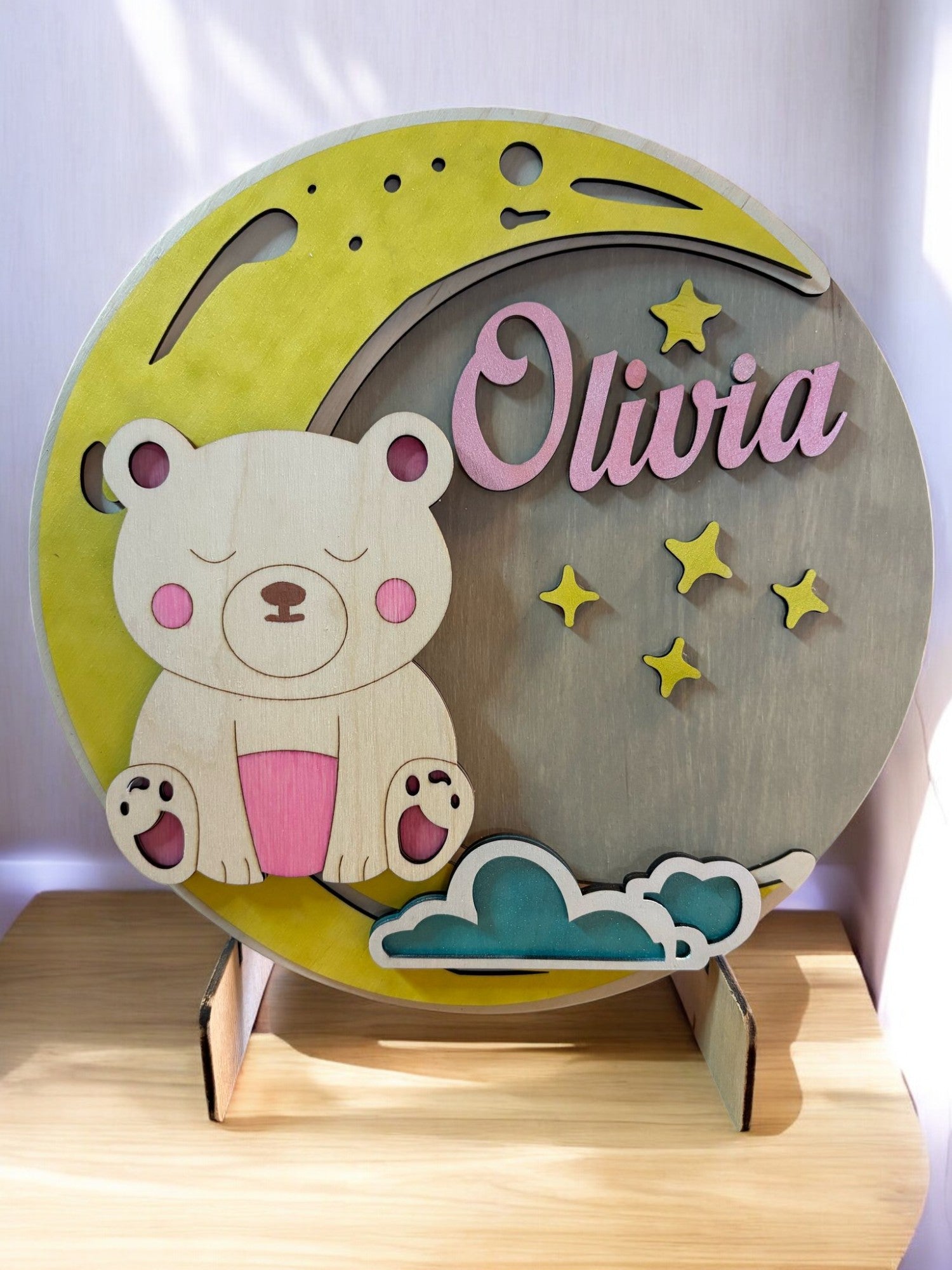 Maak de kinderkamer compleet met dit unieke, handgemaakte houten naambordje met schattig beer! Elk bordje is zorgvuldig gelaserd en geschilderd, met beer die rust op de maan, omringd door sterren en wolken.